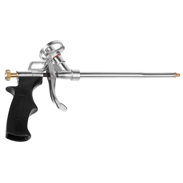Материал: Корпус и адаптер - алюминиевый сплав, никелированное покрытие; рукоятка - полипропилен; ствол, игла и игольчатый клапан - нержавеющая сталь; курок - никелированная сталь; сопло - омедненная латунь; регулировочный винт - омедненная сталь. Длина ствола 18 см. Применение: Предназначен для нанесения монтажной пены в полости, пустоты и отверстия при проведении ремонтных работ, а также при установке окон, дверей, крыш, различных элементов строительных конструкций. Преимущества: алюминиевый корпус, точная дозировка пены, работа при низких температурах, высокая скорость и точность работы, низкий расход монтажной пены. Комплектация: пистолет, насадка, пластиковый удлинитель.