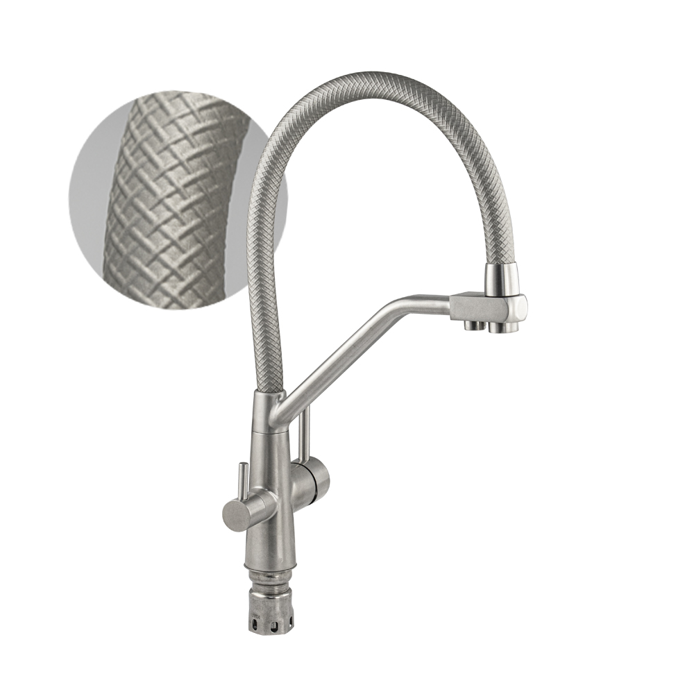 Смеситель MAGNUS для кухни с гибким изливом с фиксацией на изливе для фильтр.воды шаров. нерж. сатин